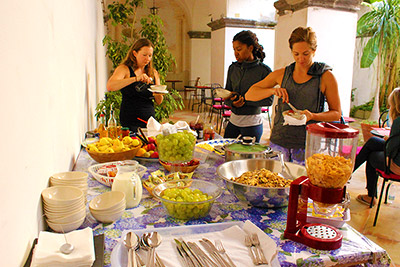 The half inside, half outside yoga shala sits next to the lemon groves of the convent. Practice yoga protected by lush greenery on one side, and a view of the sea on the other side. The convent is open and spacious, offering many unique locations for practicing yoga, meditating or doing workshops. Practice in the yoga shala, or choose from one of the many other wonderful spaces.